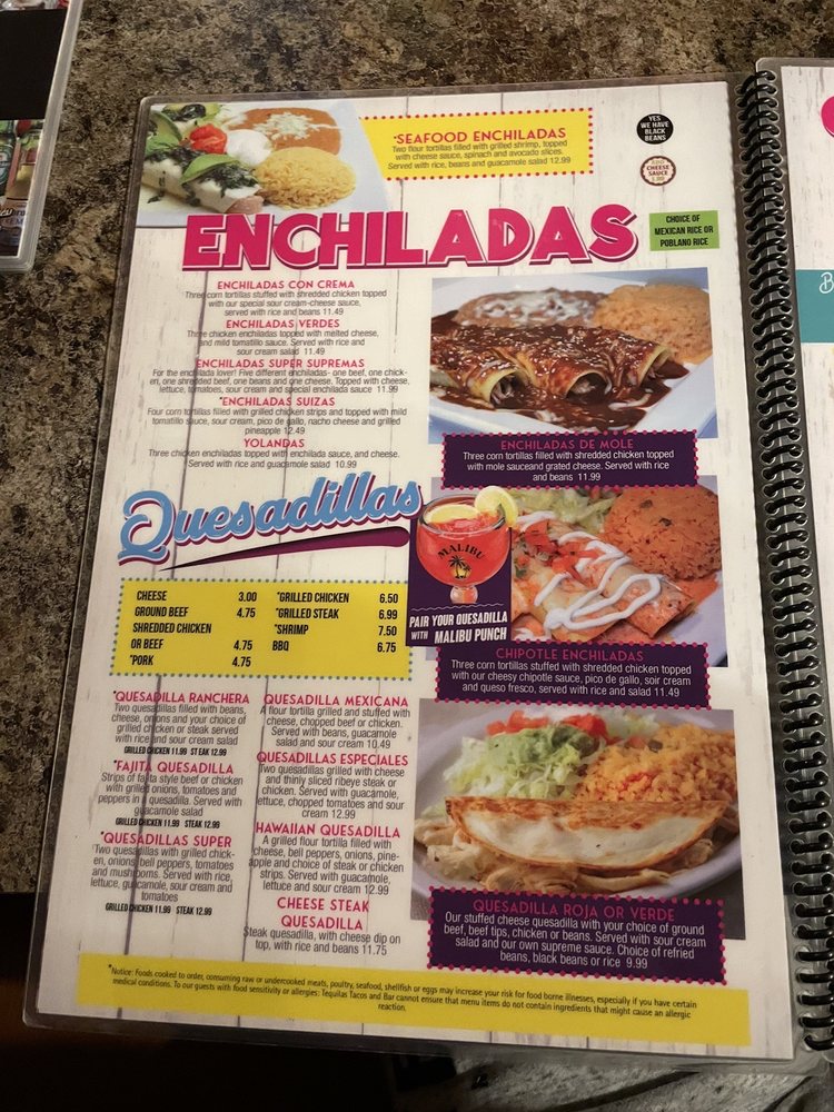 2 flour tortillas filled with grilled shrimp, topped with cheese sauce, spinach and avocado slices. Served with rice, beans and guacamole salad.